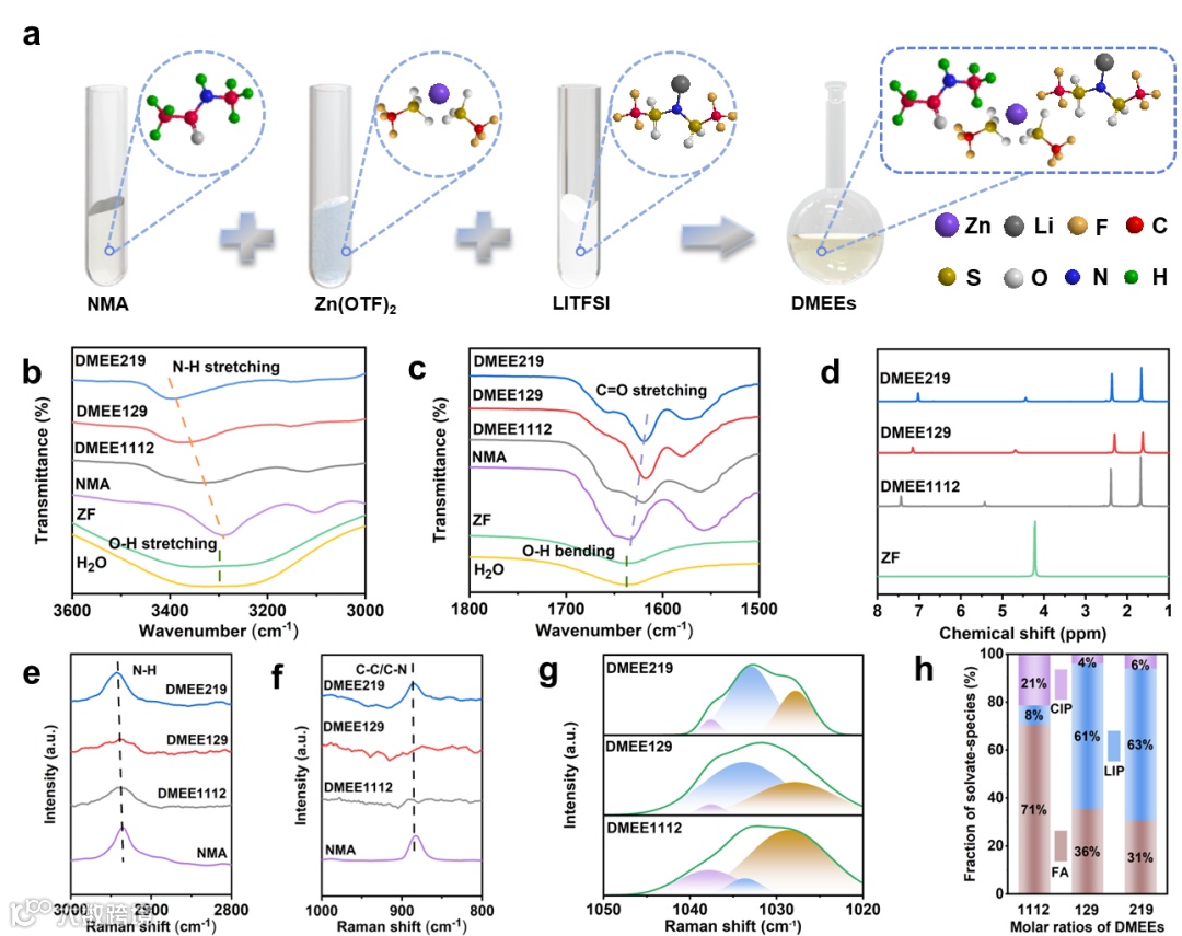 a) DMEEs的制备示意图。b-c) DMEEs的FTIR光谱。d) DMEEs的1H NMR 谱。e-g) DMEEs的拉曼光谱。h) DMEEs中溶剂化物种分布(游离阴离子(FA)、松散离子对(LIP)和接触离子对(CIP))。