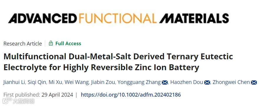 近日,来自大连化物所的陈忠伟院士团队通过支撑盐策略,设计了多功能双金属盐衍生三元共晶电解液(DMEEs),以实现无枝晶和长寿命的ZIBs。其成果以题为:“Multifunctional Dual-Metal-Salt Derived Ternary Eutectic Electrolyte for Highly Reversible Zinc Ion Battery”在国际知名期刊Advanced Functional Materials上发表。本文第一作者为河北工业大学硕士研究生李建徽,通讯作者为大连化物所陈忠伟研究员、张永光研究员和窦浩桢副研究员。该观点文章提出了一种新颖的支撑盐策略来设计用于高度可逆ZIBs的多功能DMEEs电解液,同时为开发设计先进的深共晶电解液提供了有效思路。