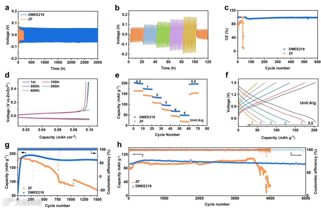 a) DMEEs的Zn//Zn电池循环性能。b) DMEEs的倍率性能。c) DMEEs的CE曲线。d) DMEEs Zn//Cu电池的容量-电压曲线。e) DMEEs的Zn//PANI全电池倍率性能。f) DMEEs的Zn//PANI全电池的比容量-电压曲线。g) 1A·g-1下Zn//PANI电池的循环性能。h) 5A·g-1下Zn//PANI电池的循环性能。