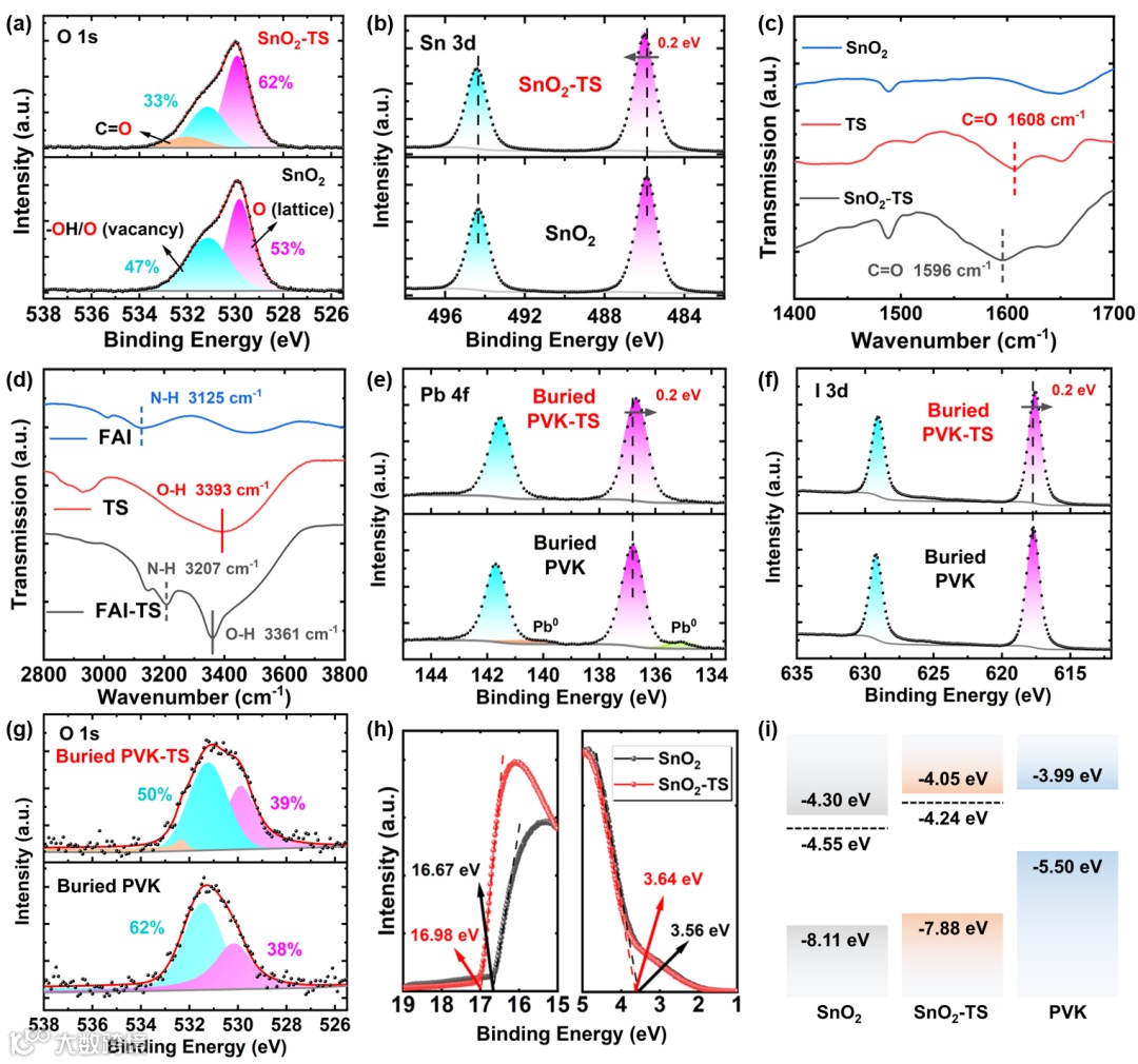 图3.(a) SnO2和SnO2-TS的O1s的XPS光谱。(b)SnO2和Sn 3d的XPS光谱,(c)SnO2、SnO2-TS和TS薄膜的FTIR光谱。(d) FAI、TS-FAI和TS薄膜的FTIR光谱。(e) 基于SnO2和SnO2-TS的掩埋钙钛矿膜的Pb 4f的XPS光谱。(f)基于SnO2的掩埋钙钛矿薄膜的I 3d的XPS光谱和SnO2-TS的I 3d。(g) 基于SnO2和SnO2-TS的掩埋钙钛矿膜O 1s的XPS光谱。(h)SnO2和SnO2-TS分别在二次电子截止区和价带区的UPS光谱。(i) SnO2钙钛矿和SnO2-TS钙钛矿的能级图。