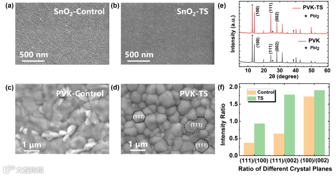 图2. (a)原始SnO2和(b)SnO2-TS的顶视图SEM图像。基于(c)原始SnO2和(d)SnO2-TS的钙钛矿(PVK)膜的顶视图扫描电镜图像。(e)基于原始SnO2的钙钛矿膜的XRD图案和SnO2-TS。(f)不同晶面的XRD峰强度比。
