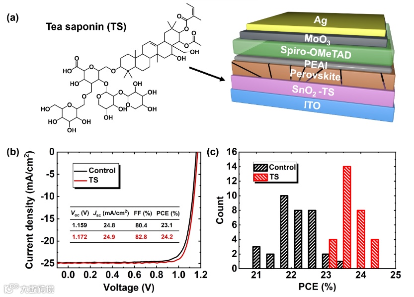 钙钛矿晶体中的不同晶面表现出不同的原子排列,影响其电子、物理和化学性质。SnO2作为电子传输层对钙钛矿薄膜在取向调控方面缺乏相关研究。本研究表明,茶皂素(TS)是一种天然化合物,可作为SnO2改性剂,促进钙钛矿晶体在(111)面上的择优生长。该方法通过氢键和路易斯配位促进了钙钛矿优先的晶体取向还能钝化钙钛矿晶体缺陷。同时,TS与SnO2相互螯合有利于制备出更光滑的SnO2薄膜,并改善其电学性质,从而促进了载流子提取并减少了SnO2的氧空位缺陷。TS改性的钙钛矿太阳能电池实现了24.2%的冠军效率,这得益于开路电压和填充因子的显著提升。未封装条件下,基于改性SnO2的PSCs具有更优异的稳定性。