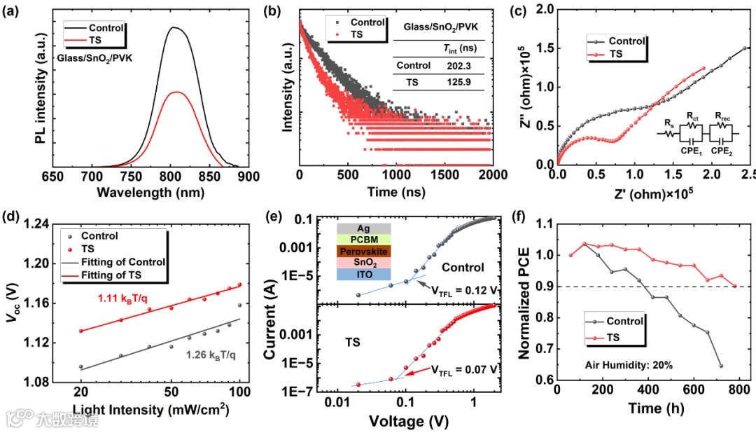 图5. (a) 在玻璃/SnO2和玻璃/SnO2-TS衬底上生长的钙钛矿膜的稳态和(b)时间分辨PL光谱。(c) 基于SnO2和SnO2-TS薄膜的器件奈奎斯特图。(d) Voc是基于SnO2和SnO2-TS薄膜的器件的光强函数。(e) ITO/SnO2/钙钛矿/PCBM/Ag结构的纯电子器件的暗J-V特性。(f)基于SnO2和SnO2-TS的未封装器件在20%RH、20°C的黑暗中的稳定性。