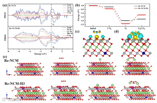 图7. a) Re-NCM和Re-NCM-H3催化剂的PDOS的比较。b)计算了Re-NCM和Re-NCM-H3表面对CO2、Li、Li2CO3吸附的能量分布。c) Re-NCM d) Re-NCM-H3与表面吸附二氧化碳分子时的电荷密度差(黄色表示Δ𝜌>0,蓝色表示Δ𝜌< 0)。e) Re-NCM、Re-NCM-H3及其相应的CO2、Li和Li2CO3吸附位点的构型。绿色球代表Li原子,灰色球代表Ni原子,蓝色球代表Co原子,紫色球代表Mn原子,红色球代表O原子。