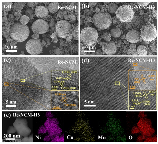 图3. a) Re-NCM和b) Re-NCM-H3的SEM图像。c) Re-NCM和d) Re-NCM-H3的高分辨率TEM图像。e) Re-NCM-H3对应的EDX图像。