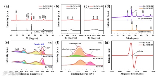 图2. a) Re-NCM和Re-NCM-H3的XRD谱图。b) (006)/(102)峰值和c) (108)/(110)峰值的放大视图。d) Re-NCM-H4和Re-NCM-H5的XRD谱图。e) Re-NCM和Re-NCM-H3的Ni 2p和(d) O1s XPS谱图。f) Re-NCM和Re-NCM-H3的EPR谱图。