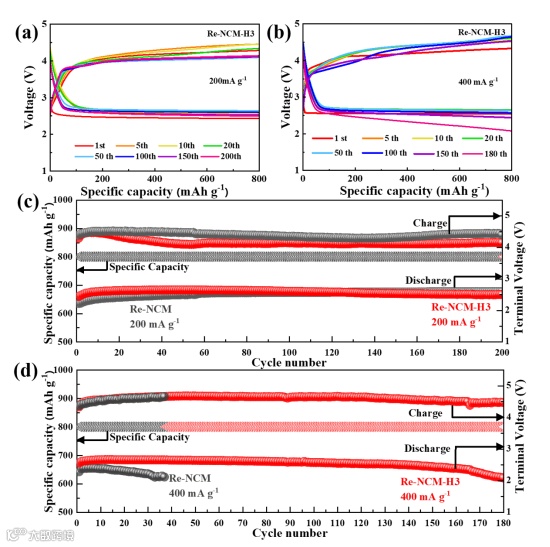 图5. 采用Re-NCM-H3催化剂的Li-CO2电池在不同电流密度下的倍率循环性。a) 200 mA g−1,b)400 mA g−1,限制比容量为800mAh g−1。Re-NCM和Re-NCM-H3催化剂的c) 200 mA g−1和d) 400 mA g−1,限制比容量为800 mAh g−1。