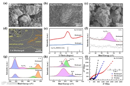 图6. Re-NCM-H3电极在不同阶段的形态及结构演变。a)原始材料,b)完全放电和c)完全充电的Re-NCM-H3正极的扫描电镜图像。d)全放电Re-NCM-H3正极的TEM图像。放电和充电的Re-NCM-H3正极的e) XRD,f) Li 1s,g) C 1s,h) O 1s XPS谱图。i)原始、放电和再充电的Re-NCM-H3阴极的EIS,插图表示了相应的等效电路。