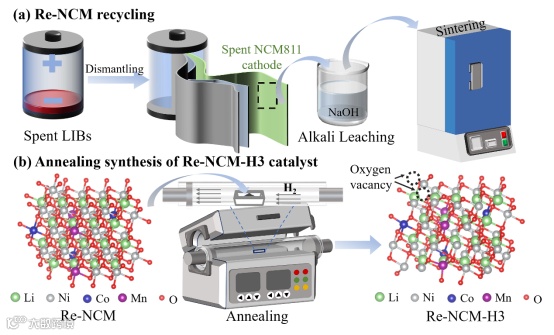 图 1. 制备含空位氧的Li-Ni-Co-Mn氧化物(Re-NCM-H3)催化剂的步骤示意图。a)从废旧的LIBs中回收NiCoMn前体(Re-NCM)。将废弃的NCM811正极溶解在氢氧化钠中,得到了混合的NiCoMn溶液。然后,将NiCoMn沉淀物烧结,制备Re-NCM前驱体。b)使用H2煅烧合成富含氧空位的Re-NCM-H3催化剂的方法示意图。