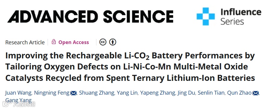 近日,来自常熟理工学院的冯宁宁副教授和昆明理工大学的赵群副教授合作,在国际知名期刊Advanced Science上发表题为“Improving the Rechargeable Li-CO2Battery Performances by Tailoring Oxygen Defects on Li-Ni-Co-Mn Multi-Metal Oxide Catalysts Recycled from Spent Ternary Lithium-Ion Batteries”的研究论文。该论文通过实验结果和理论计算相结合,发现适量氧空位的引入优化了费米能级 (Ef) 附近的电子态,最终改善了NCM材料对CO2的吸附和电荷转移。作者通过煅烧从废旧LIBs回收的NCM制备了TMO催化剂(标记为Re-NCM-H3)。使用Re-NCM-H3催化剂的Li-CO2电池具有高容量(11808.9 mAhg−1),较低的过电位(1.54 V),以及在100 mA g−1下的216圈循环和在400 mA g−1下的165圈循环的优异稳定性。本研究不仅提出了废旧锂离子电池三元正极材料的可持续应用,而且验证了多元素氧缺陷TMO催化剂在高效Li-CO2电池中的潜力。