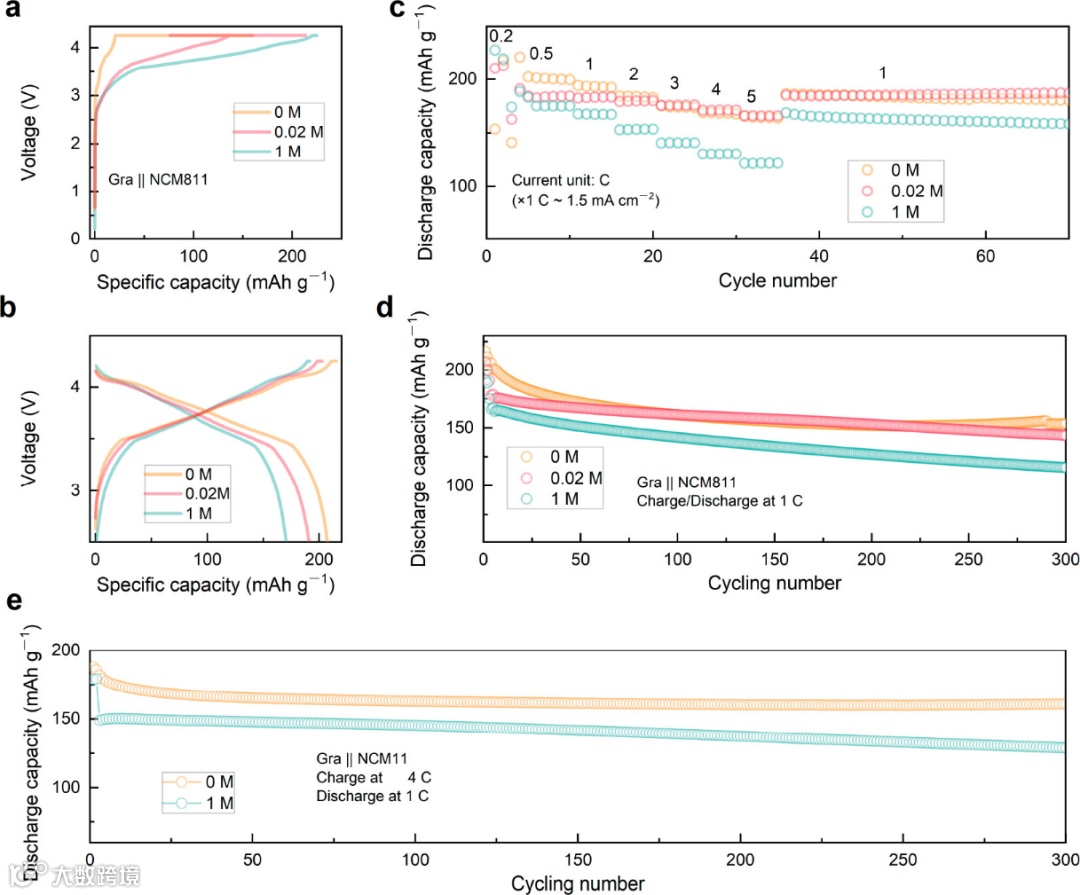 图5. 不同浓度电解质下室温下石墨||NCM811全电池的比较电化学性能。(a)0, 0.02, 和1 M电解质下的形成曲线。(b)在0, 0.02, 和1 M电解质化成后在0.2 C倍率下的充放电曲线。全电池的(c)倍率性能和(d)1 C倍率循环性能。(e)全电池在4 C充电倍率下的循环性能。