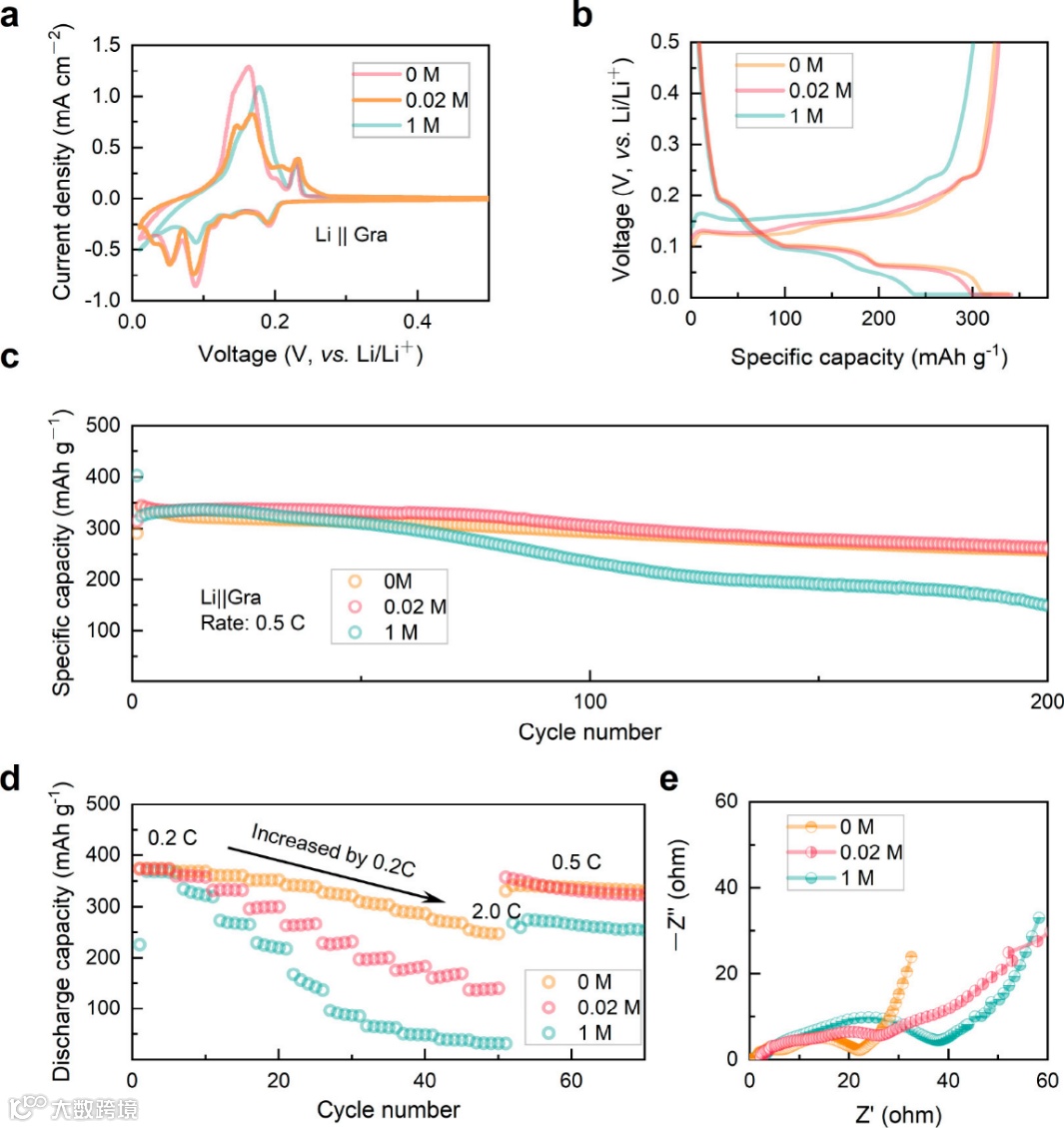 图3. 不同浓度电解质化成的Li||graphite电池的电化学性能。(a)使用0, 0.02, 和1 M电解质化成的Li||graphite半电池的初始循环伏安图。(b)用CC–CV(0.2 C到0.01 C)制式测得的0, 0.02, 和1 M电解质化成电池的初始放电–充电曲线。(c)在0.5 C倍率下半电池的循环性能。(d)半电池的倍率性能。(e)不同浓度电解质化成后循环前电池的Nyquist图。