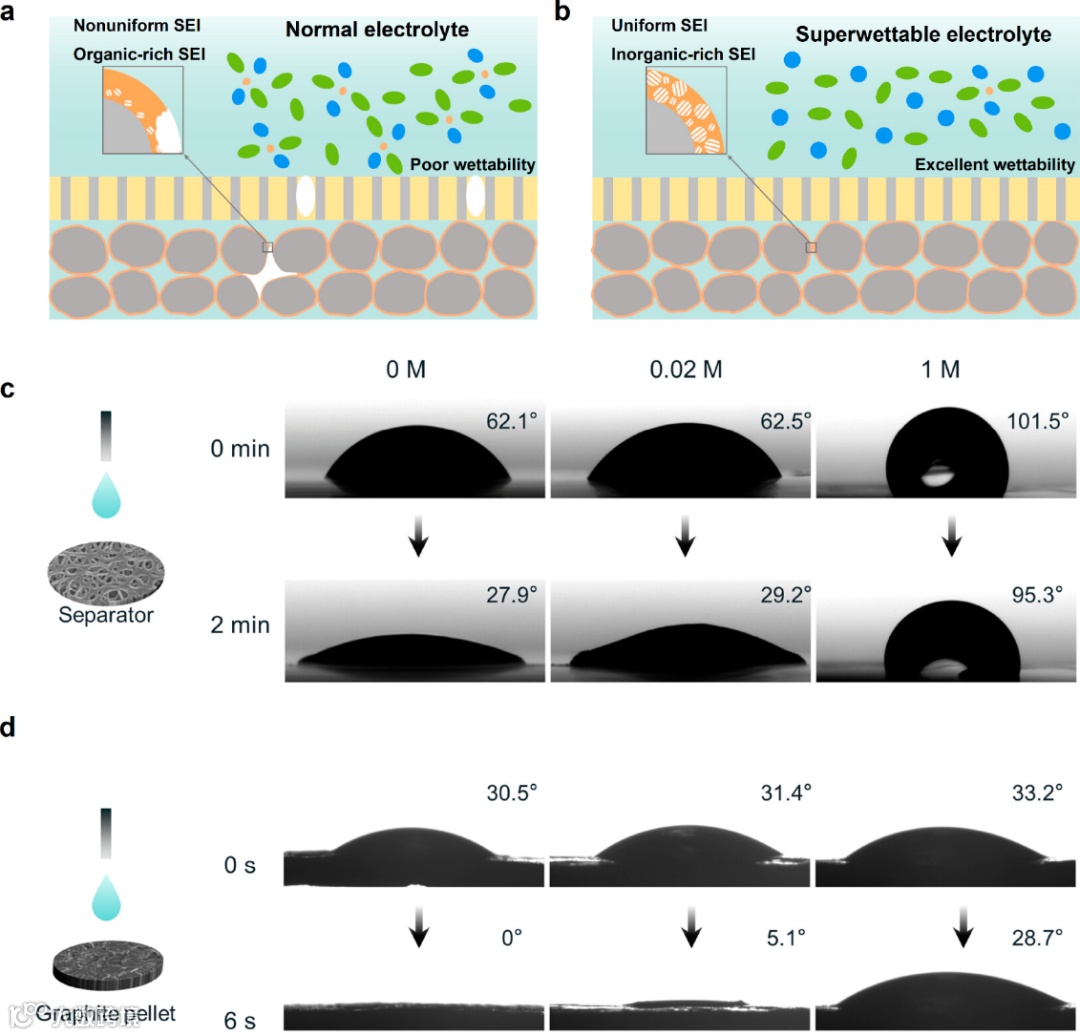 图1. 不同浓度电解质下石墨电极上SEI层的形成示意图:(a)正常浓度电解质,(b)超低浓度电解质。不同浓度电解质在(c)PE隔膜和(d)石墨片表面的接触角测量。