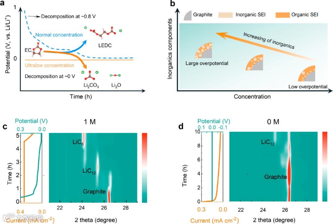 图2. (a)不同化成模式下LIBs石墨负极中SEI层形成的示意图和(b)不同浓度电解质下SEI层形成的示意图。不同电位下(c)1 M和(d)0 M浓度电解质负极的非原位XRD图。