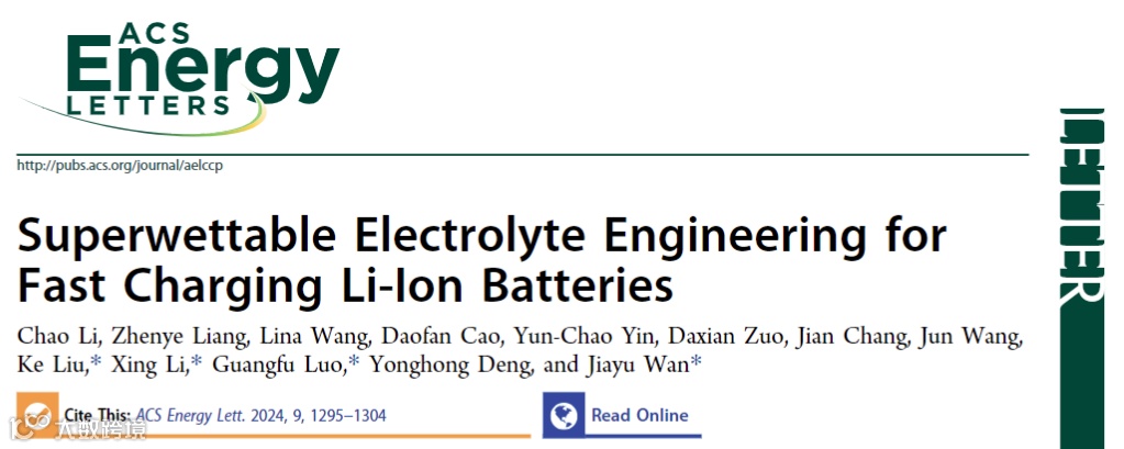 近日,上海交通大学万佳雨教授团队和南方科技大学刘科教授、罗光富教授、邓永红教授等合作,提出了一种通用的电池界面工程的分步注液策略,该策略利用二次注液,首先使用超低浓度的超润湿电解质达到实现石墨负极上 SEI 层的均匀且完全覆盖。该电解质在低电流形成过程中会引起较高过电位,从而形成富含无机成分的 SEI 层。因此,采用超湿润电解质的锂离子电池表现出卓越的循环稳定性和 5 C 的高倍率性能(容量为 166 mAh g-1),这一特性在软包电池中也得到了验证。这种分步注液,同时利用低浓度电解质诱导高过电位。相关文章以“Superwettable Electrolyte Engineering for Fast Charging Li-Ion Batteries” 为题发表在《ACS Energy Letters 》(IF: 22.0)期刊上。
