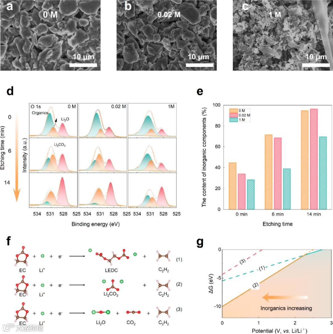 图4. a)0 M,(b)0.02 M,和(c)1 M电解质中化成的循环后石墨负极的SEM。(d)石墨负极的相应O 1s XPS光谱。(e)基于XPS拟合结果的石墨负极上无机组分的含量。(f)石墨负极上EC可能的分解反应。(g)图f中三个反应的吉布斯能量随电位的变化。
