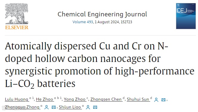 近日,来自华南理工大学的廖世军,张正国教授与加拿大国立科学研究院的孙书会教授合作,在国际知名期刊Chemical Engineering Journal上发表题为“Atomically dispersed Cu and Cr on N-doped hollow carbon nanocages for synergistic promotion of high-performance Li–CO2batteries”的研究文章。该文章报道了一种新型的 Cu 和 Cr 双单原子共掺杂催化剂,应用于Li-CO2电池显示出优异的性能。