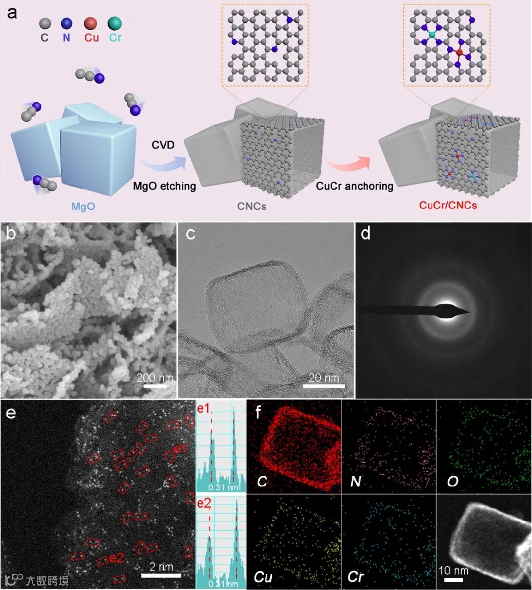 要点一:复合催化剂的特殊形貌与结构。样品在锚定Cu/Cr原子后,依然保持了规则的立方体纳米笼结构。通过TEM/HRTEM验证了材料的中空纳米笼结构,纳米笼壳层厚度大约为3 nm,且在超薄的孔壁上未发现任何颗粒或团簇状结构。通过HAADF-STEM进一步确认了金属物种的分散状态。由图中可以观察到,大量孤立的亮点均匀分布在碳框架中。依据该测试技术的成像原理,图像中出现的成对亮点,很可能是与氮原子桥接的Cu-Cr原子对,根据测量,Cu和Cr原子之间的距离大约为3.1 Å。