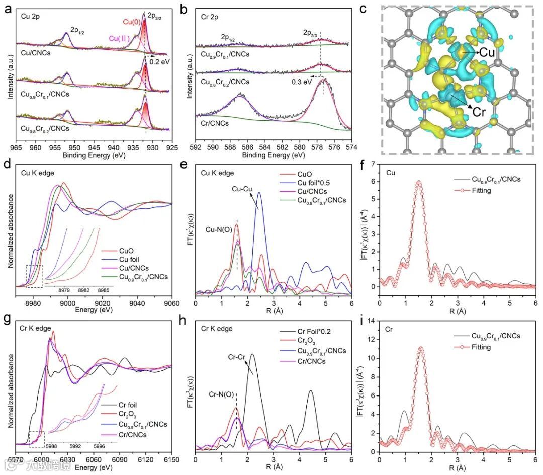 要点二:催化剂中的配位结构。结合同步辐射与球差电镜测试结果,在CuCr/CNCs 催化剂中可能形成了特定的氮配位结构,例如N3-Cu-N-Cr-N3,其中两个 M–N4(M 代表Cu或Cr)配位结构通过共享N原子相互连接。在这种结构中,两个金属原子之间的距离估计为3.2 Å,这与HAADF-STEM图像中观察到的金属原子间距约为3.1 Å的结果十分接近(见图6-1e)。综合得知,我们推测催化剂中存在 N3-Cu-N-Cr-N3这样的杂原子配位结构。此外,从 DFT 计算得到的N3-Cu-N-Cr-N3结构的电荷密度分布图显示,Cu原子区域呈现富电子状态(以黄色表示),而Cr原子区域则表现为缺电子状态(以蓝色表示),揭示了电子从Cr位点向Cu位点的转移,这一发现与实验数据的分析结果相符。