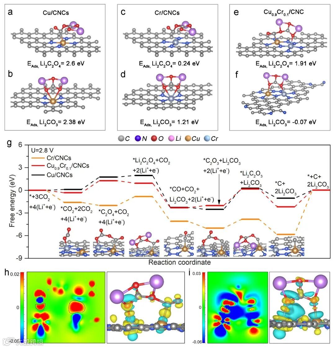 CuCr/CNCs 上的(h)Li2C2O4和(i)Li2CO3吸附构型电荷密度的2D和3D图像