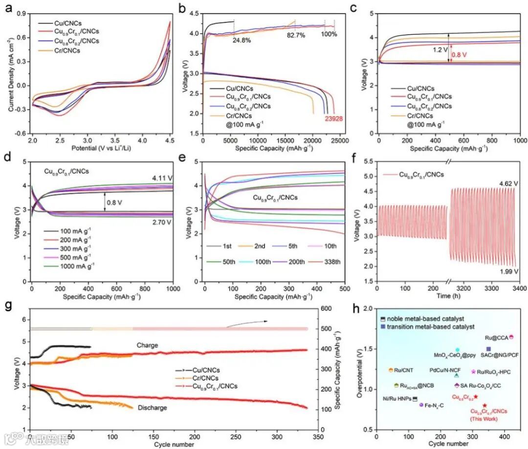 要点三:催化剂的优异性能。不含贵金属的CuCr/CNCs 阴极的电池展现了最高的放电比容量(23928 mAh g-1)和最低的过电位(1.2 V),并且实现了100%的库仑效率。进一步测试显示,该阴极实现了超过338个循环的长寿命,并且维持了较低的过电位。相对而言,Cu/CNCs和Cr/CNCs 电池分别仅完成了74和122个循环,且其电压间隙就达到了2.76 V和2.35 V,进一步证实Cu/Cr原子间的协同作用显著提升了催化剂在Li-CO2电池中的容量、倍率性能以及稳定性。