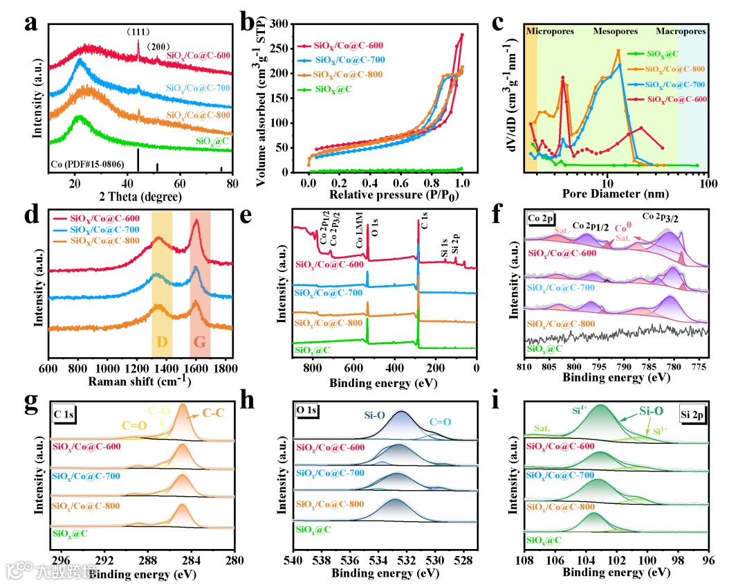 图1. (a) XRD图,(b) 氮吸附等温线和(c) 孔径分布,(d) 拉曼光谱。SiOx/Co@C-600、SiOx/Co@C-700、SiOx/Co@C-800和SiOx@C的XPS谱:(e) 全谱、(f) Co2p、(g) C 1s、O 1s和Si 2p。