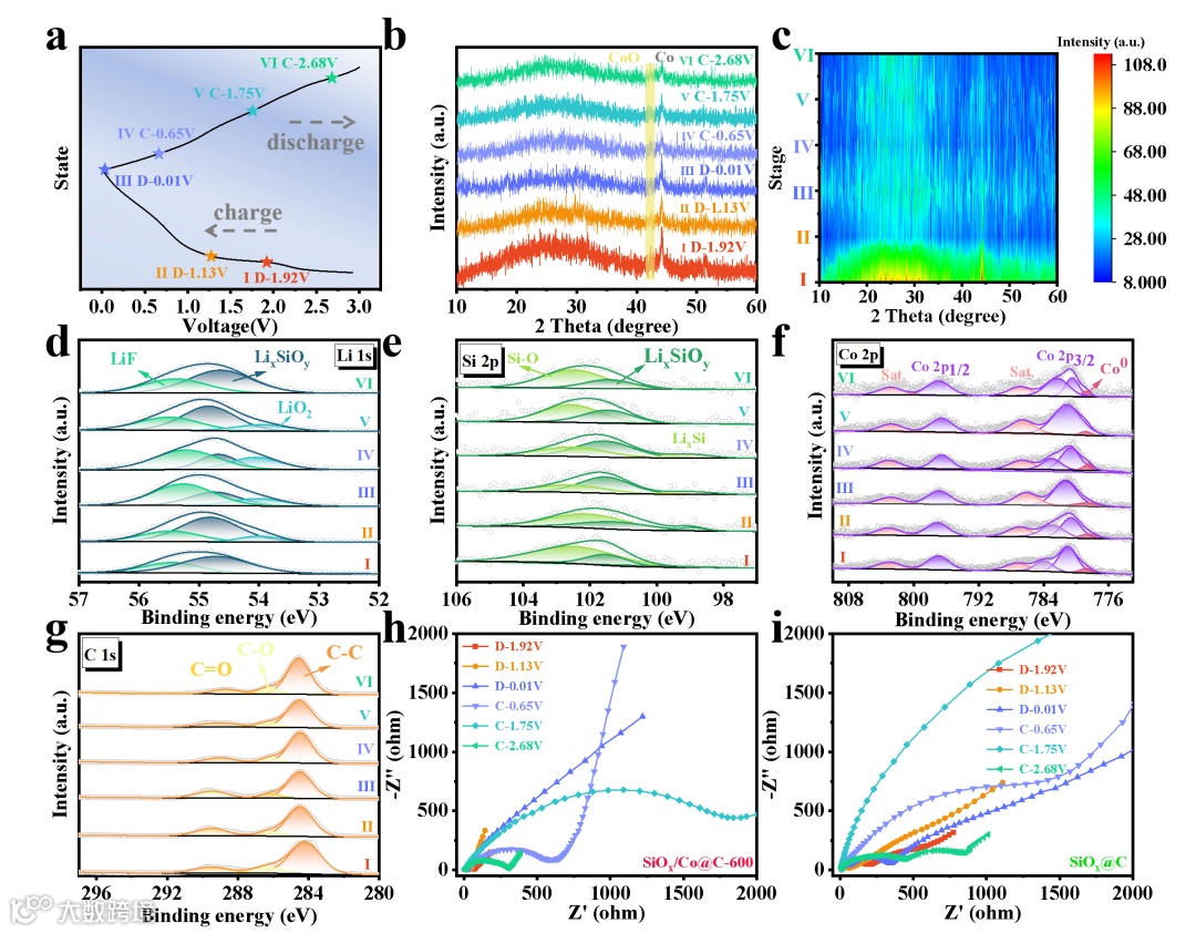 图3. (a) SiOx/Co@C-600电极在0.1 A g-1条件下的放电/充电曲线。(b) SiOx/Co@C-600电极在不同电压下的非原位XRD模式。(c) SiOx/Co@C-600对应的等高线图。SiOx/Co@C-600的不同放电/充电阶段的非原位XPS:(d) Li 1s、(e) Si 2p (f) Co 2p和(g) C 1s。(h) SiOx/Co@C-600和(i) SiOx@C的不同放电/充电阶段的非原位EIS。