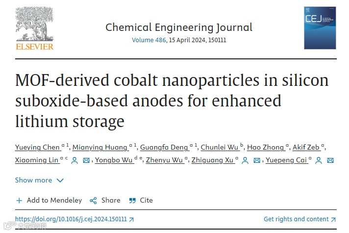 MOF衍生钴纳米颗粒修饰氧化硅负极用于增强锂存储。