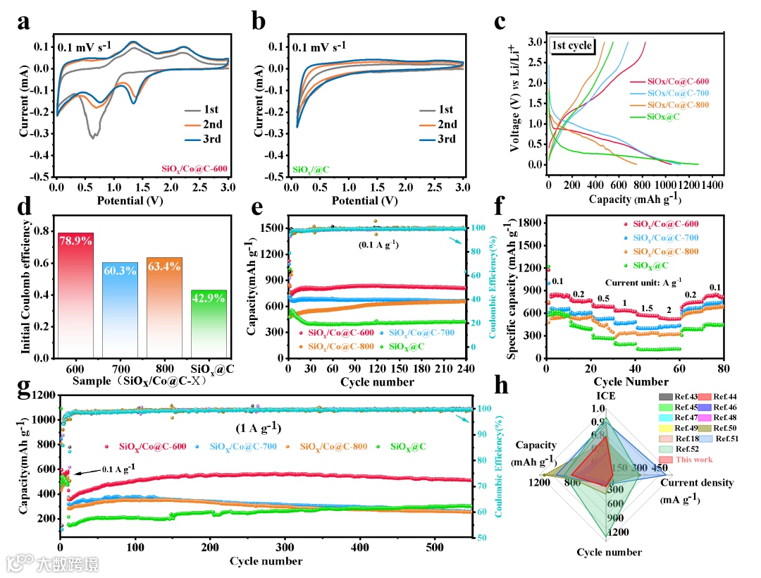 图2. CV曲线: (a) SiOx/Co@C-600和(b) SiOx@C。(c) 初始放电/充电曲线,(d) 初始库仑效率,(e) 循环性能,(f) 0.1至2 A g-1不同电流密度下的速率性能,(g) 1 A g-1高电流密度下的长循环稳定性。(h) SiOx/Co@C-600材料的电化学性能与以往研究成果的比较。
