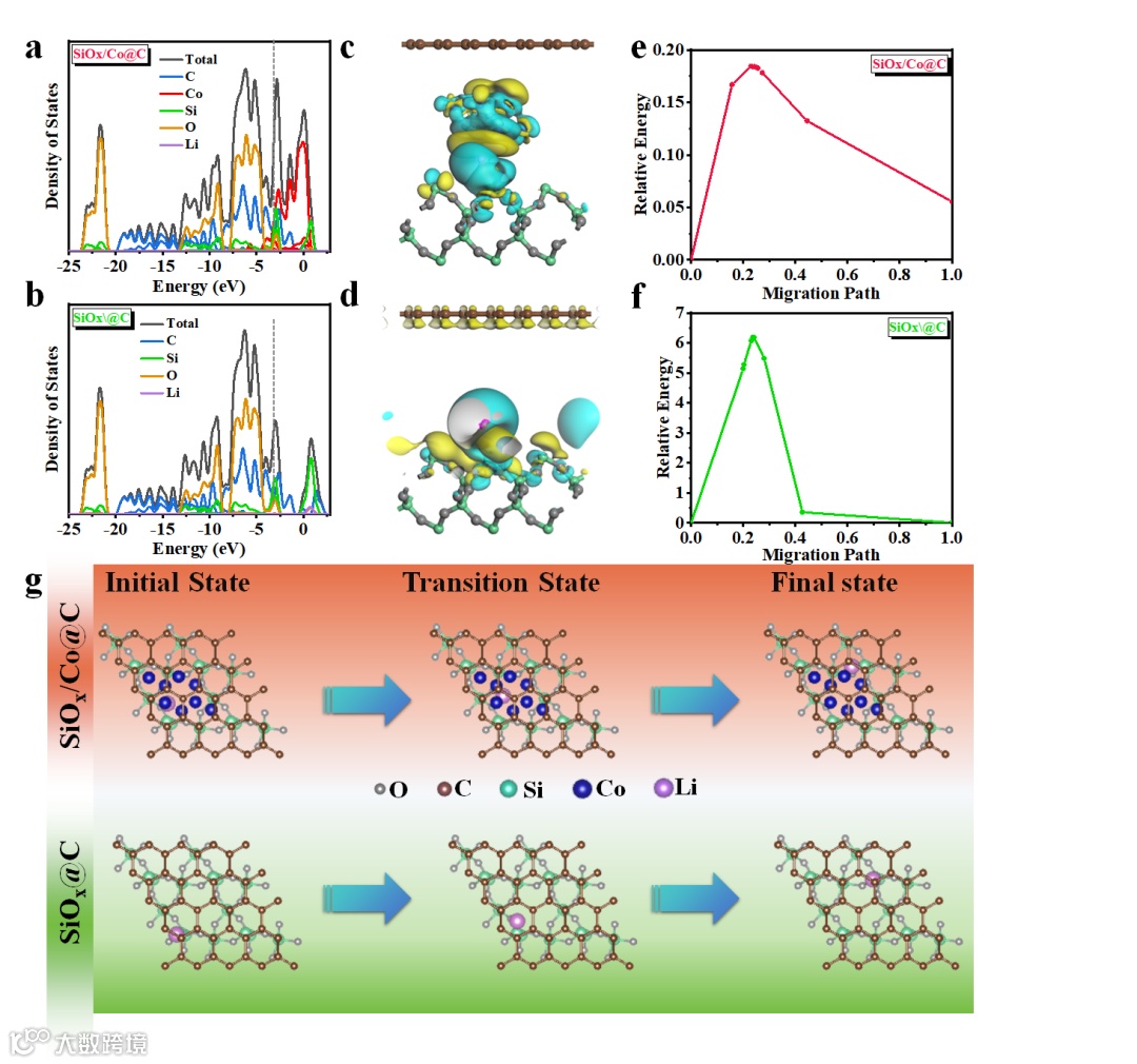 图4 .(a、b) DOS曲线,(c、d) 电荷密度分布和(e、f) 迁移能量势垒。(g) SiOx/Co@C和SiOx@C对应的Li+迁移路径。