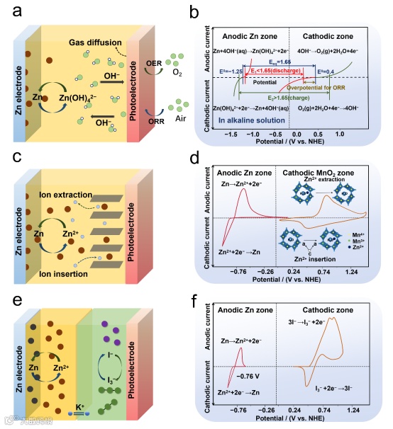 从热力学和动力学的角度来看,利用太阳能作为存储设备可以提高电池的容量,从而揭示了新的供电应用场景。通过对复杂电极材料的电池结构的创新设计和调节,研究者通过电池配置设计探究一系列光激励型锌空气电池、锌离子电池和锌液流电池。综述分别对这些电极的发展进行了介绍:从单一响应充电或放电到同时响应优化充放电电压,从液态电池到全固态光响应电池,从刚性到柔性,从实验探究到应用到实际场景,从光辅助充电到光充电。