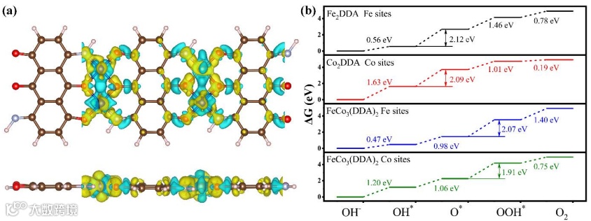图7.FeCo3(DDA)2的差分电荷密度图和OER过程中含氧中间体的吸附自由能 。