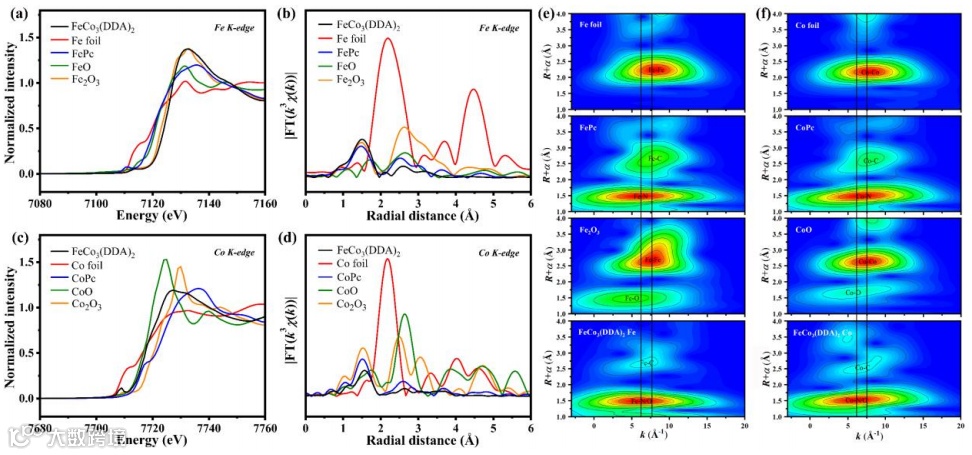 图3. FeCo3(DDA)2的XANES、FT-EXAFS和WT-EXAFS。