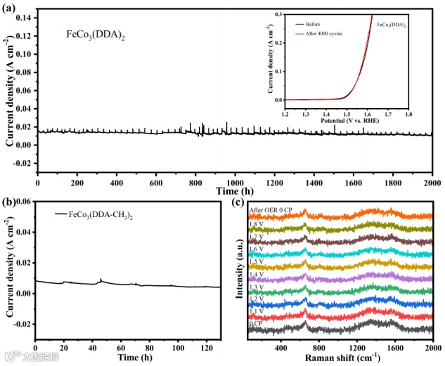 以1 M KOH为电解液,对FeCo3(DDA)2进行了OER测试。极化曲线(LSV)显示, 10 mA cm-2电流密度下,FeCo3(DDA)2的过电位为260 mV,高于其他Fe/Co比例的样品及RuO2(291 mV),因此FeCo3(DDA)2具有最佳的Fe/Co比,且Fe/Co之间存在协同效应。此外,FeCo3(DDA)2具有更低的Tafel斜率、阻抗(EIS)和更高的电化学活性面积(ECSA),说明FeCo3(DDA)2具有更优的反应动力学,更低的电荷转移电阻以及更多暴露的电化学活性位点。此外,FeCo3(DDA)2表现出了长达2000 h的电催化OER稳定性,而FeCo3(DDA)2仅在130 h后电流密度就衰减了51.26%。FeCo3(DDA)2的稳定时间远远长于目前报道的MOFs基电催化剂。反应前后的XRD、TEM、XPS、准原位XPS和原位拉曼进一步证明了FeCo3(DDA)2具有良好的结构稳定性。
