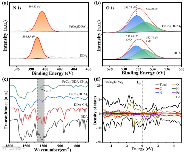 图4. FeCo3(DDA)2的XPS、FTIR和TDOS谱图。