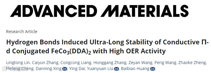 近日,来自山东大学的黄柏标教授、刘媛媛教授和山东高等技术研究院邢丹宁助理研究员,在国际知名期刊Advanced Materials上发表题为“Hydrogen Bonds Induced Ultra-Long Stability of Conductive π-d Conjugated FeCo3(DDA)2 with High OER Activity”的文章。该文章报道了具有高电催化OER稳定性的π-d共轭MOFs FeCo3(DDA)2,稳定性长达2000 h。FeCo3(DDA)2结构中存在的氢键,加强了其结构,是其具有超高OER稳定性的主要原因。