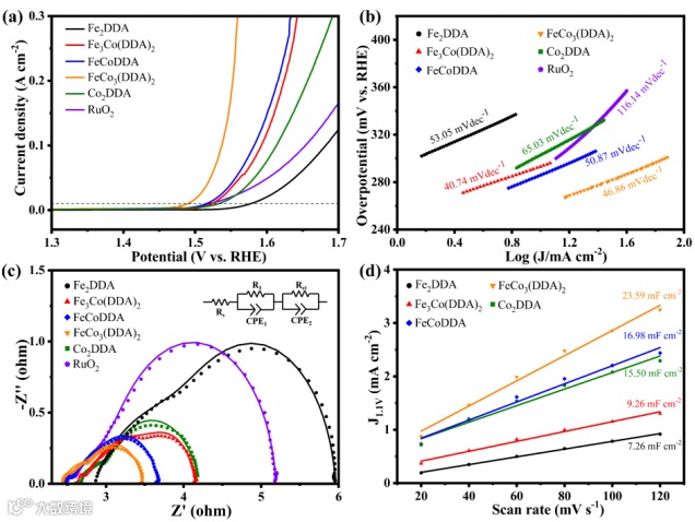 图5. FeCo3(DDA)2的LSV、Tafel、EIS、ECSA曲线。