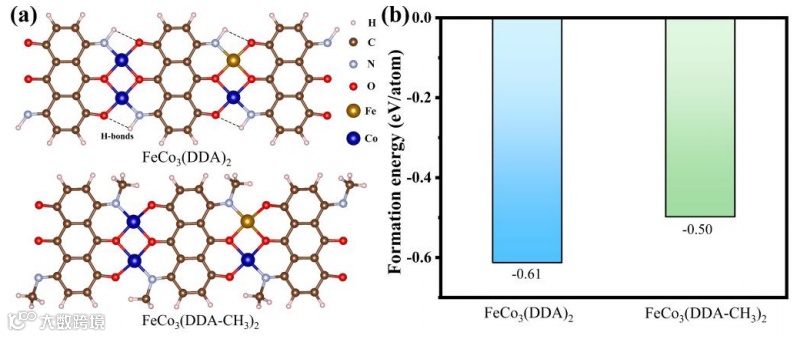 图1. FeCo3(DDA)2及FeCo3(DDA-CH3)2的结构和形成能。