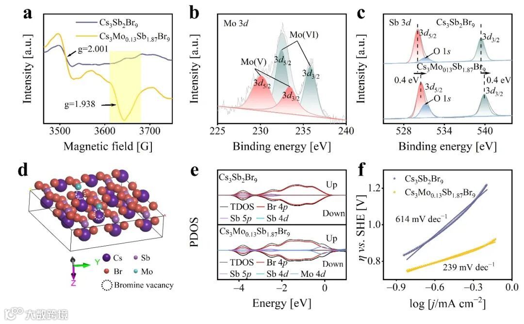 图4(a)Cs3Sb2Br9和Cs3Mo0.13Sb1.87Br9的ESR光谱。Cs3Sb2Br9和Cs3Mo0.13Sb1.87Br9的高分辨率XPS光谱图(b)Mo 3d和(c)Sb 3d。(d)Cs3Mo0.13Sb1.87Br9晶格的结构示意图。(e)Cs3Sb2Br9和Cs3Mo0.13Sb1.87Br9的PDOS构型图。(f)Cs3Sb2Br9和Cs3Mo0.13Sb1.87Br9的塔菲尔斜率图(η:电位,pH = 0)。