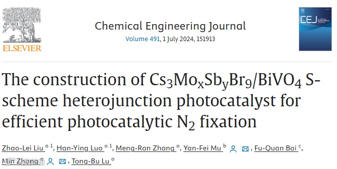 近日,天津理工大学的张敏教授团队在国际知名期刊Chemical Engineering Journal上发表题为“The construction of Cs3MoxSbyBr9/BiVO4 S-scheme heterojunction photocatalyst for efficient photocatalytic N2fixation”的文章。该工作通过原位平面到点生长工艺制备了Cs3MoxSbyBr9/BiVO4 S型异质结,实现了非铅卤化钙钛矿在光催化氮还原中的首次应用。