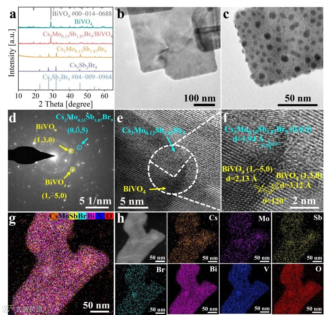 Cs3Mo0.13Sb1.87Br9/BiVO4的选择区电子衍射(SAED)图(图3d)显示出两组衍射条纹,表明Cs3Mo0.13Sb1.87Br9与BiVO4之间形成了纳米级异质结。Cs3Mo0.13Sb1.87Br9/BiVO4的高分辨率TEM(HRTEM)图像(图3e)表明了Cs3Mo0.13Sb1.87Br9和BiVO4材料之间通过重叠晶格构建的紧密集成界面。它还清晰地显示了Cs3Mo0.13Sb1.87Br9的(005)晶格面以及BiVO4的(1−50)和(130)晶格面的特征间距(图3f),分别为1.94 Å、2.13 Å和3.12 Å。此外,元素映射分析(图3g)表明,Cs、Mo、Sb、Br、Bi、V和O元素分布均匀,其中Cs3Mo0.13Sb1.87Br9纳米晶的Cs、Mo、Sb和Br元素均匀分布在BiVO4纳米片表面,进一步证实了Cs3Mo0.13Sb1.87Br9/BiVO4的成功构建。