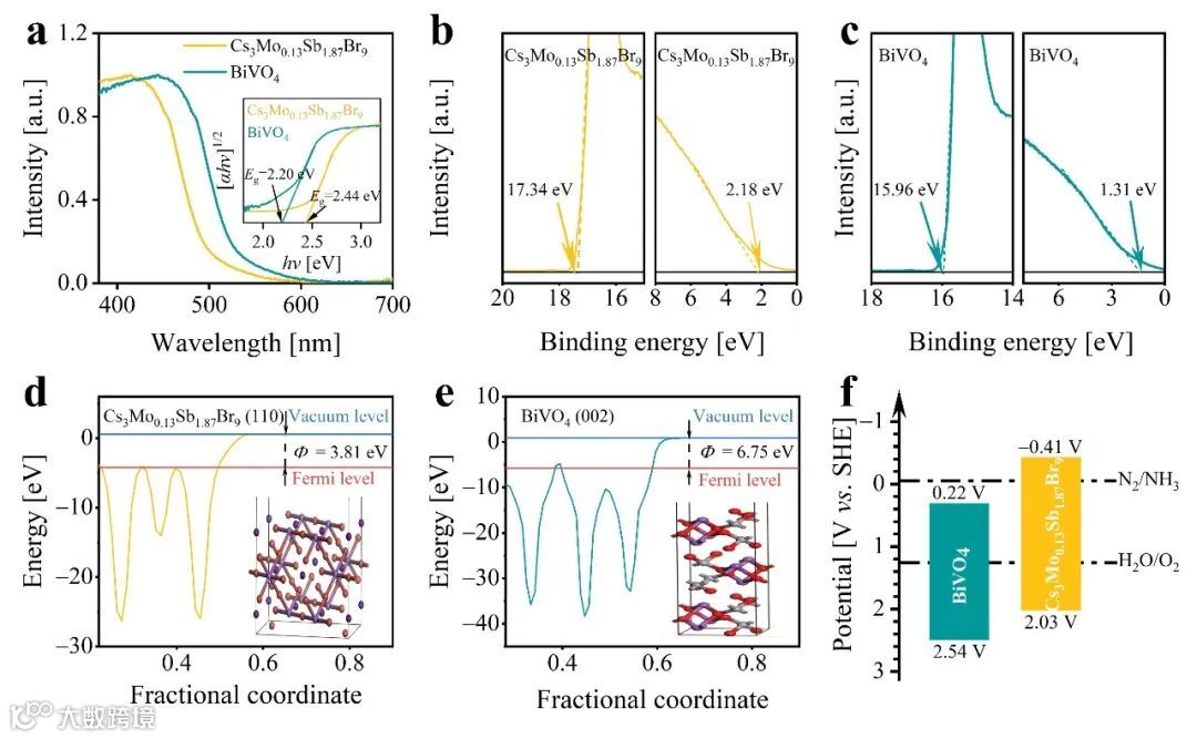 图5(a)Cs3Mo0.13Sb1.87Br9和BiVO4的紫外可见漫反射光谱和相应的Tauc图以及(b,c)UPS光谱。(d)Cs3Mo0.13Sb1.87Br9(110)和(e)BiVO4(002)的功函数。(f)BiVO4和Cs3Mo0.13Sb1.87Br9的能带结构。