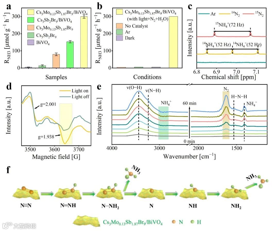图6(a)以BiVO4、Cs3Sb2Br9、Cs3Mo0.13Sb1.87Br9、Cs3Sb2Br9/BiVO4和Cs3Mo0.13Sb1.87Br9/BiVO4为光催化剂光催化还原N2的产率图,(b)对照试验,(c)以14N2或15N2为反应气氛的产物的1H NMR光谱图,(d)Cs3Mo0.13Sb1.87Br9/BiVO4在 大气中暗或光下的原位ESR光谱图,(e)光还原N2反应的原位DRIFTS光谱图,(f)光还原N2反应的模拟反应途径示意图。