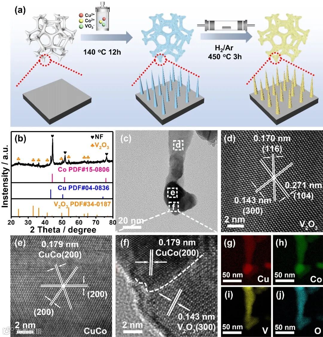 图2. CuCo-V2O3纳米线催化剂的(a)的合成示意图;(b)XRD图;(c-f)HEM和HRTEM图;(g-j)元素能谱图。