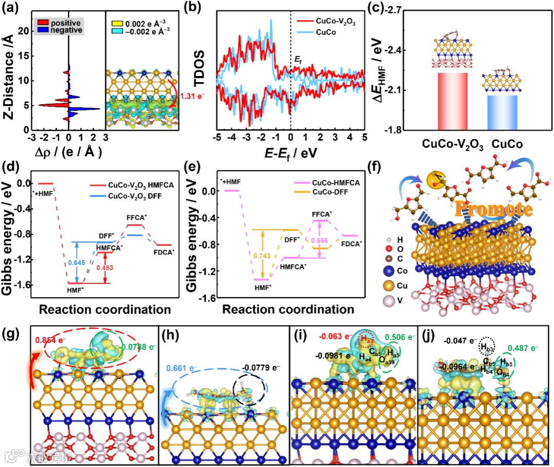 图6.(a)CuCo-V2O3的电荷密度差分图;(b)总态密度图;(c)HMF在CuCo-V2O3和CuCo上的吸附能和优化构型;基于(d)CuCo-V2O3和(e)CuCo计算的HMFOR过程的自由能图;(f)CuCo-V2O3上HMFOR过程被活化促进的示意图;(g-j)关键中间体HMFCA在催化剂上的电荷转移行为和电荷密度差分图。