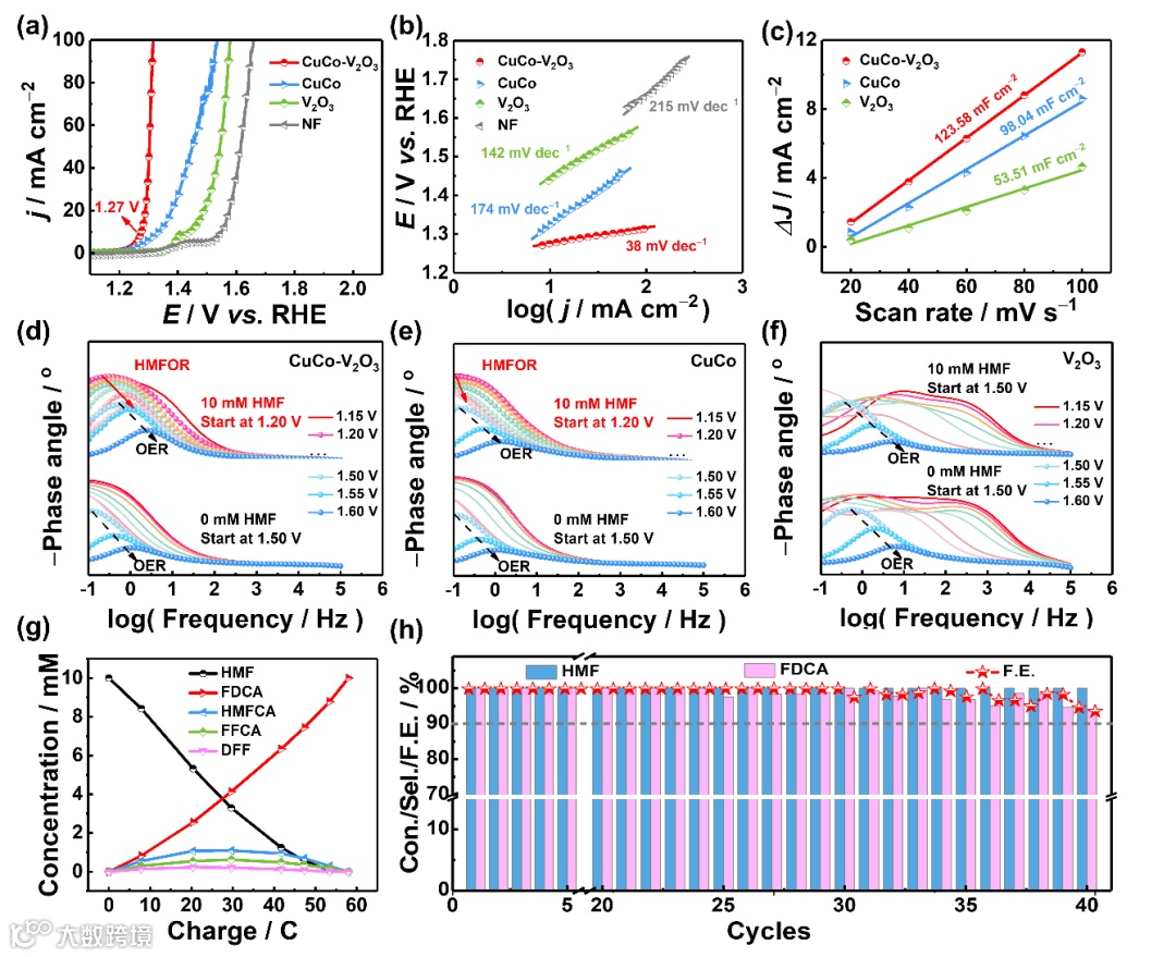 图4. 各样品的(a)HMFOR极化曲线,(b)塔菲尔斜率,(c)双电层电容,和(d-f)原位阻抗波特图;(g)电催化转化过程中HMF,FDCA及中间体的浓度随通过电荷变化图;(h)三电极体系中CuCo-V2O3在40个循环转化中的HMF转化率,FDCA产率和法拉第效率。