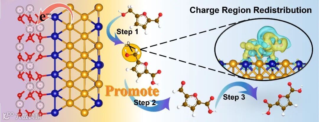 电催化氧化5-羟甲基糠醛反应(HMFOR)因反应条件温和可控、反应产物具高附加值等优点而受到越来越多的关注。由于HMFOR涉及6电子转移过程,需要高活性催化剂来加快反应速率。因此,揭示催化反应机理并据此设计具有快速反应动力学的高活性催化剂至关重要。HMF氧化为FDCA涉及呋喃环上羟甲基/醛基逐步氧化为羧基,可通过分析羟甲基/醛基在催化剂表面的活化程度进而探究性能提升的原因。且电催化反应中电子在电极、电解质与底物之间相互传递,电荷的传递及分布情况影响并反映催化性能。因此,利用理论计算结合实验的方法研究催化剂结构设计与反应物活化机制之间的联系具有重要意义。