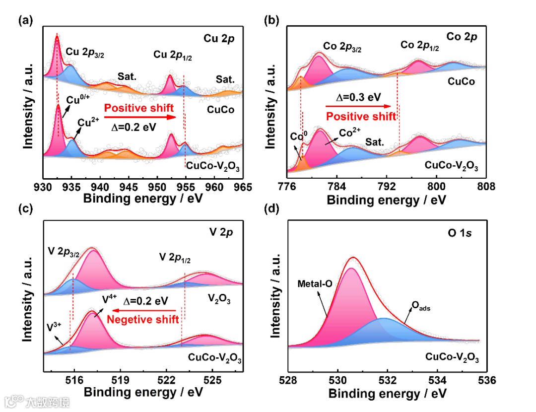 图3. CuCo-V2O3,CuCo,和V2O3各元素的XPS谱图:(a)Cu 2p;(b)Co 2p;(c)V 2p;(d)O 1s。