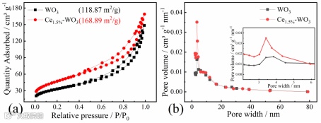 图4 WO3和Ce1.5%-WO3的N2吸附-解吸等温线(a)和孔径分布(b)