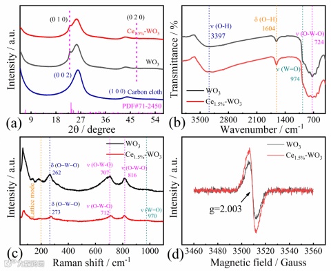 图2,Ce1.5%-WO3的XRD谱图与未掺杂WO3的结构保持一致,没有出现与氧化铈或其他杂质相关的明显峰。在WO3中引入Ce后,红外波段明显变宽。Ce掺杂WO3的部分拉曼峰位置发生位移,这可能是由于Ce离子占据了WO3中的取代位。Ce1.5%-WO3的EPR峰强度高于WO3,这不仅表明Ce1.5%-WO3中产生了更多的单电子,有效地增加了氧空位的含量,而且非常有利于产生更高的电导率,以上表征均证明Ce成功掺杂到WO3的主晶格中。